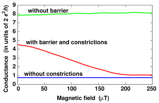 In Figure 2, we report the conductance as a function of the magnetic field in this cavity with a red solid line. Instead, the blue line represents the conductance that would be obtained just with the barrier, without the constrictions, while the green line corresponds to the conductance that would result just as a consequence of the two constrictions, without any barrier. Thus, with respect to the simple barrier alone, in the absence of a magnetic field, the symmetrically placed constrictions raise the conductance to more than one half of what would be reached without any barrier.