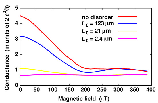In all of our calculations, we consider a Fermi level of 10 meV, which is typical for the 2DEG obtained by modulation doping at a GaAs/AlGaAs heterointerface. With this Fermi level, the number of propagating modes in the widest structures that we consider ( m) is around 180. Thus, we include in the simulation a total of 300 transverse modes, with a transverse discretization over 400 points. For the largest and most complex structures that we consider, the computational time that is required for the evaluation of the conductance for 30 values of the magnetic field (averaging over 40 energy values) is about 10 hrs on a 40 core machine with Intel Xeon E5-2640 processors (Intel, Santa Clara, CA, USA).