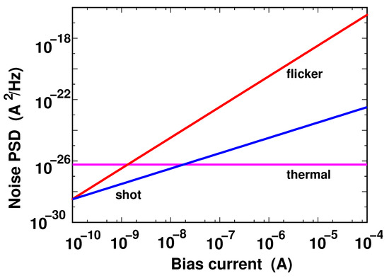 As mentioned in the introduction, we now evaluate the minimum measurable magnetic field level in terms of flicker noise. Both thermal noise and shot noise do not pose fundamental limitations, since the former is constant and the latter only increases linearly with the bias current, as shown in Figure 8. It is only flicker noise (besides generation-recombination noise, which, however is not always present and, in any case, is less relevant than flicker noise at low frequencies) that represents a fundamental limitation.