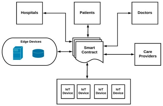 - Griggs, K.N.; Ossipova, O.; Kohlios, C.P.; Baccarini, A.N.; Howson, E.A.; Hayajneh, T. Healthcare blockchain system using smart contracts for secure automated remote patient monitoring. J. Med. Syst. 2018, 42, 130. [Google Scholar] [CrossRef]