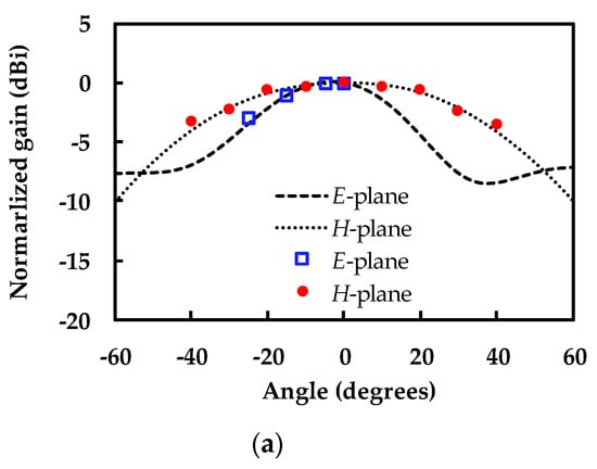 The radiation characteristics of the fabricated on-chip antenna were measured using the in-house antenna measurement setup designed by the authors [11]. RF power is applied to the on-chip antenna under test (AUT) through the RF probe, and the radiated power is measured by the standard horn antenna and zero-biased detector which are installed on the spherical arm of the setup. The receive angle of the horn antenna can be manually controlled to measure the radiation pattern. The antenna gain of the AUT is determined by comparing the received power with the AUT connected, with the received power with the AUT replaced with the standard horn antenna of a known gain as follows [11,13,17].