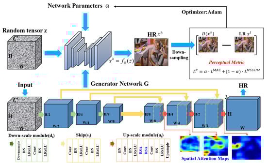 Recently, Dmitry Ulyanov et al. proposed the Deep Image Prior (DIP) model [], which uses a randomly initialized network as a parameterized representation of an image. DIP does not require a large amount of images for network pre-training. Based on the observation model of a degraded image, the DIP model reconstructs the original image from the degraded observation by iteratively optimizing the maximum likelihood estimation of the network parameters. Nevertheless, there is still a performance gap between DIP and the pre-trained networks. The network architecture and the loss function are two important factors that affect the reconstruction performance. In DIP, an hourglass-like network with MSE (mean squared error) loss is used. However, it is generally believed that MSE loss, namely loss, is inconsistent with perceived characteristics of human vision system [,]. Therefore, minimizing the MSE loss cannot necessarily maximize the visual quality of the reconstructed image [,]. The network architecture should be further improved to capture visually sensitive features.