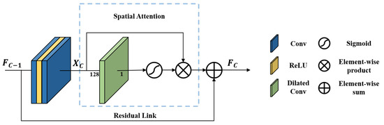 The inner diagram of RSA unit is shown in Figure 2. Motivated by Reference [,], RSA adopts residual learning mechanism, and the output of RSA is computed as the sum of input and input masked by the predicted attention map. The mathematical formulation of RSA is