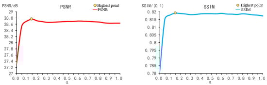 The curves of PSNR and structural similarity (SSIM) values versus different values. The point corresponding to the highest PSNR or SSIM value has been highlighted.