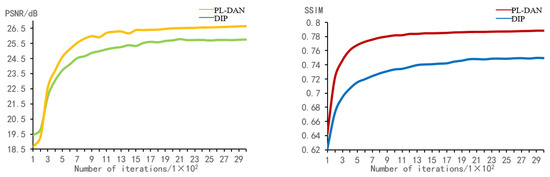 The iteration number in network learning. Both PM-DAN and DIP use iterative optimization to generate the HR images that match the LR observation as much as possible. The number of iterations will impact the final result. Figure 4 presents the PSNR and SSIM curves of PM-DAN and DIP versus iteration numbers upon the Zebra image from the Set14 in the case of 4× super resolution. The maximum iteration number is set as 3000. It can be seen that both the PSNR and SSIM curves of PM-DAN and DIP increase rapidly before 1500 iterations, then rise slowly to 2000 iterations and saturate near 3000 iterations. Although the PSNR and SSIM curves of PM-DAN and DIP follow a similar trend, PM-DAN has a higher PSNR and SSIM than DIP. Taking account of the compromise between time complexity and reconstruction performance, we select 2000 iterations for PM-DAN and DIP in the following experiments.