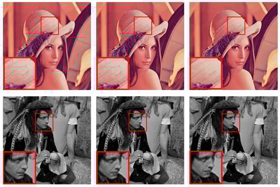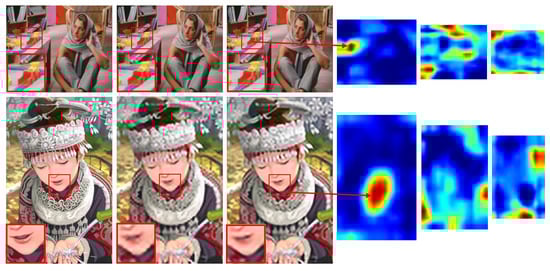 The SR images of Barbara and Comic by PM-DAN and PM-DAN without RSA units are shown in Figure 6. The multi-scale spatial attention maps predicted by RSA units are also presented. We can see that the attention maps at different scales exhibit high response intensity in different areas, and the union of these high-response areas can almost cover the entire image. With the progressive refinement of the scale of the attention map, the areas with high response intensity mainly concentrate on the flat and local structures of image, which are consistent with sensitive characteristics of HVS. Due to contrast masking phenomenon of HVS [], reconstruction distortions in structural areas are more likely to be perceived than texture regions. With the aid of RSA units, PM-DAN can well localize the visually sensitive areas at different scales, thus the visually informative structures can be preserved in the reconstructed image, especially in the area with highlighted attention response. This also explains why the combination of the perceptual metric and attention units can produce the better reconstruction results. Taking the image comic as an example, the spatial attention map at the finest scale has high response strength in the area of Girl’s chin. Accordingly, Girl’s chin is reconstructed with enhanced visual quality.