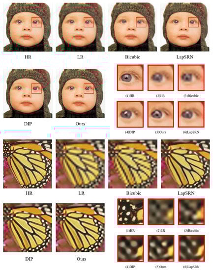In the four cases of experiments, the PSNR and SSIM values of the proposed PM-DAN are all better than DIP. Moreover, PM-DAN has better PSNR and SSIM values than the pre-trained SRCNN in the case of 4× SR upon Set5 and Set14. PM-DAN can also achieve comparable results with the pre-trained LapSRN, and even outperforms LapSRN in some cases, such as the averaged PSNR value in the case of 8× SR upon the Set5 and the averaged SSIM value in the case of 4× SR upon the Set14. Some 4× and 8× reconstructed images are shown in Figure 7 and Figure 8, respectively. The zooming-in display of different patches are also presented. With the aid of pre-training, the SR results of LapSRN also show good visual quality. PM-DAN can reconstruct the HR image with sharp structures and texture details, and has better visual quality than DIP. The brightness and color of the reconstructed image can also be well preserved by PM-DAN. In the case of 8× SR, PM-DAN can even recover the clearer structures than LapSRN, such as the eyes in the Baby image and the spot textures in the Butterfly image.