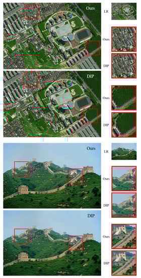 We further evaluate the performance of our method by conducting the SR experiments on two real images from the internet, one remote sensing image and one landscape image. Figure 9 presents the 4× SR results of our method and DIP upon these two images. The resolutions of the 4× SR images of these two images are 864 × 576 and 1088 × 736, respectively. We can see that, compared to the DIP, our method can recover sharp structures and more texture details. As shown in the zooming-in patches of the remote sensing image, our method can reconstruct more details in the areas of house and wood. With regard to the landscape image, the reconstructed image of our method has good contrast and saturation, which makes the reconstructed image visually attractive.