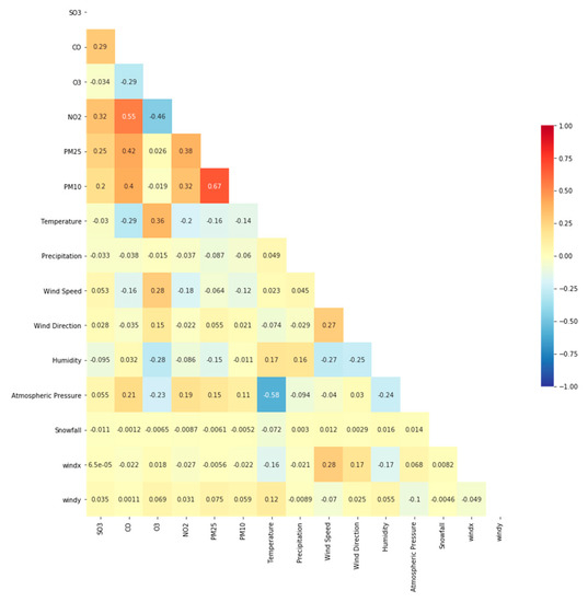 NO2 and CO are related to automobile emissions [33], and SO2 and PM are related to factory emissions. O2 is produced when there are NO2 and NO in the atmosphere [34]. SO2, NO2, and O3 have a high correlation with PM [34], and a low correlation between CO and PM [35].