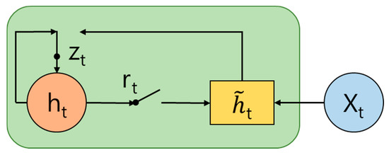 The GRU model is an improved model of complex equations in the LSTM model. The following is the structure of the GRU model (Figure 4). The GRU model consists of the reset gate and the update gate. The GRU model is a model that improves the computation speed of the LSTM model.