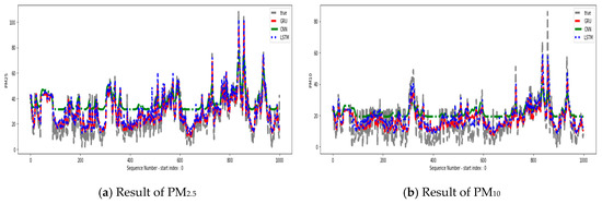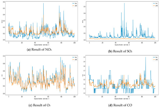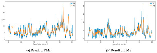 We analyzed the correlation between CO and PM by comparing weather data and weather data with CO. As a result, it was confirmed that RMSE and MAE of PM2.5 and PM10 were lowered (Table 13), and hence CO is related to PM2.5 and PM10. The actual and predicted values of PM10 and PM2.5 were compared (Figure 9). The orange line is the predicted value, and the blue line is the actual value. We confirmed that the accuracy of PM prediction is improved via CO.