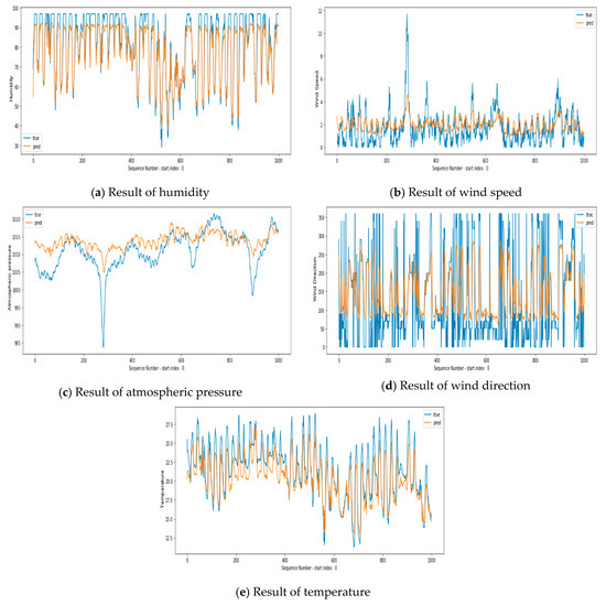 A comparison graph of actual and predicted values for atmospheric pressure, temperature, wind speed, wind direction, and humidity. (a) Predicted and actual values of humidity; (b) predicted and actual values of wind speed, (c) predicted and actual values of atmospheric pressure; (d) predicted and actual values of wind direction; (e) predicted and actual values of temperature.