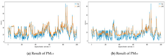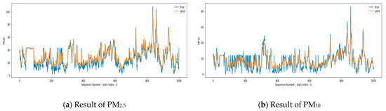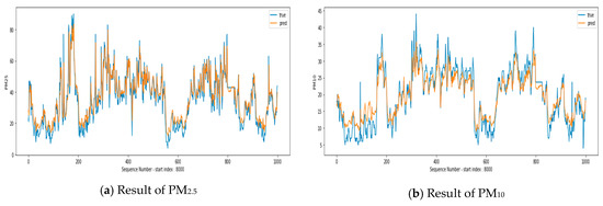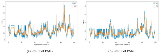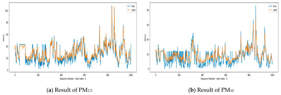 We used the address format as discussed in the Section 2.3.3. The results were compared with Table 9 and confirmed to be improved (Table 18), and hence, the city and road are separated and affected by adjacent cities and provinces. These are the actual and predicted values of PM10 and PM2.5 (Figure 14). The orange line is the predicted value, and the blue line is the actual value. We confirmed that the accuracy of PM prediction is improved via address format.