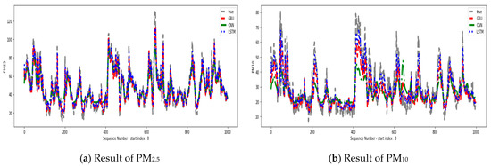 A graph of the actual and predicted values of PM10 and PM2.5 using weather data with CO. (a) Predicted and actual values of PM2.5; (b) predicted and actual values of PM10.