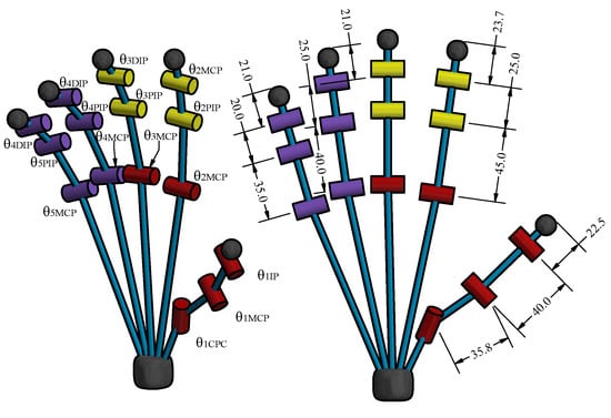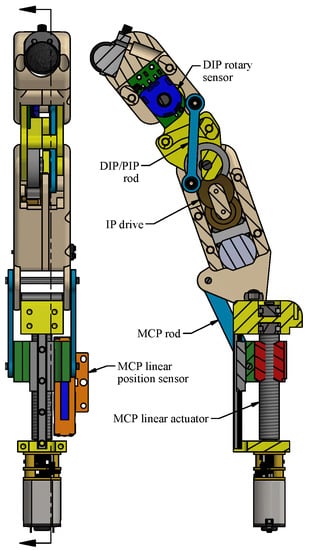 Index and middle fingers are designed as fully actuated, with two degrees of freedom. MCP is driven independently, while PIP and DIP share the same drive. This configuration provides full control over fingertip position in finger’s 2D plane while maintaining mechanical simplicity (MCP is a single DoF joint with no adduction or abduction ability). The fingers share the same design and dimensions, allowing for easier manufacturing and parts interchangeability. Overall finger dimensions of 18 mm (width) by 20 mm (height) closely correlate with adult mean index finger width []. Annotated design of the finger is shown in Figure 4.