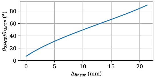 The linear actuators fit within the palm of the gripper and flex the fingers using aluminium rods. The relation between actuator position and finger flexion is shown in Figure 5. The structure reaches maximum efficiency at , exerting the force of 8.7 N at the fingertip.