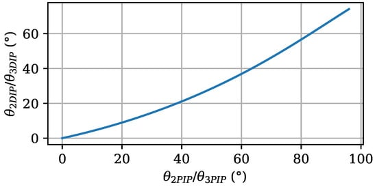 The second drive resides inside the proximal phalanx. The drive uses motor and metal gears from Hitec (gear set 56,396), used in a range of miniature digital servos (e.g., HS-5245MG). The gearbox was reconfigured to fit in narrow space of the phalanx and drives PIP directly. Movement is passed to DIP using an aluminium rod. Angle feedback is provided at DIP using an Alps RDC503013A rotary resistive sensor. Relation between PIP and DIP angles is shown in Figure 6. The rotation ratio between PIP and DIP was chosen, so with both drives fully flexed, the fingertip touches the metacarpus. When fully extended, the drive exerts the force of 8.0 N at the fingertip.