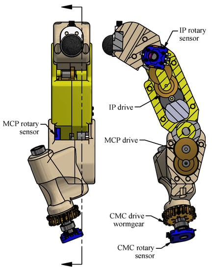 Mechanical design and drives of fully actuated thumb; CMC drive motor and worm (not visible) are enclosed in the metacarpus.