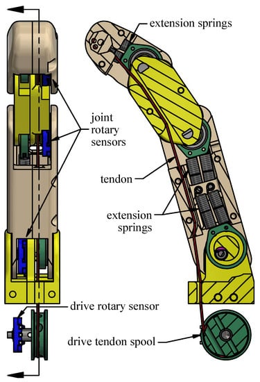 An eccentric ring is placed around each joint axle and attached to a pair of helical extension springs. While in other approaches springs have been used to store potential energy for efficiency improvements [], here they are required to return the finger to its extended position and distribute flexion evenly among the three joints. To limit the number of required off-the-shelf part types, all joints share the same type of springs, with only the anchor radius of the spring differentiating the extension torque. The torque was adjusted experimentally to allow the fingers to straighten in the most demanding orientation (with palm facing downwards), without adding too much additional resistance to the drive. The overall design of the finger is shown in Figure 8. Both fingers share the same design, but proximal and intermediate phalanges are shorter in the little finger.