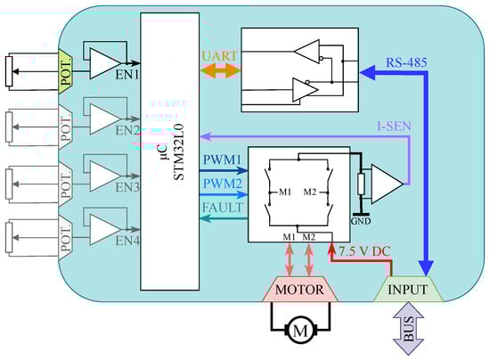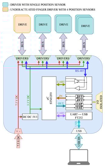 Each DRIVER is a separate servomechanism unit consisting a printed circuit board, a DC motor and resistive position sensors, presented in Figure 11. Two types, with the different number of position sensor connectors, are used in the system. Standard DRIVER supports only one potentiometer, in case of underactuated finger configuration a board with support for four sensors is used. The board features a RS-485 transceiver in half-duplex mode with the a switchable driver. A Texas Instruments DRV8872 MOSFET-based H-bridge with peak 3.6 A current capacity serves as an execution circuit in controlling brushed DC motor. An integrated H-bridge with over-current, under-voltage, and over-temperature protection, including fault interrupt pin is used. High-current side of the motor driver is supplied by 7.5 V DC. Remaining parts of the DRIVER board are supplied by 3.3 V DC. DRIVER also implements a motor current measurement circuit based on a sense resistor. Acquisition of all sensor data, PWM generation, and communication with the HUB unit are carried out by low-power STM32L0 family microcontroller with ARM Cortex-M0+ core running at 32 MHz.