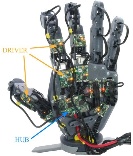 The low-level controller of PUT-Hand was designed with high modularity in mind. The main unit, called HUB, is responsible for communication with the high-level controller (e.g., a PC), communication with individual servomechanisms, and (optionally) internal drive position control. Each servomechanism (referred to as DRIVER) is a separate, independent module consisting of a direct-current (DC) motor, an adequate number of encoders, and a printed circuit board with all necessary communication and motor control circuitry. Overall controller architecture is shown in Figure 9. DRIVER modules are connected to the HUB using a bus configured in a star pattern, which allows for easy replacement of faulty drives integrated into the mechanical design of the hand. Controller attachment and arrangement on PUT-Hand is visible in Figure 10. The system is fully scalable and can be used in designs with various drive configurations, not limited to grippers.