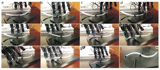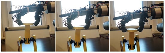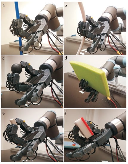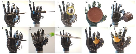 PUT-Hand is a hybrid design, taking advantages of both fully actuated [,,] and underactuated [,] designs. Fully actuated fingers can be used for precise grasping (Figure 15) and interaction with elastic objects (Figure 16), while underactuated fingers stabilise the grasp during dealing with heavy objects such as bottles (Figure 15g) or large objects.
