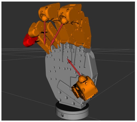 Gears are used mainly in the fully actuated fingers to transfer the torque from the drive to the joint [,,]. Rods become popular when the drives are located in the palm and the rods push the finger links []. This approach reduces the weight of the fingers. The lighter hands are actuated by the pneumatic chambers []. In this case the fingers are made of elastic material and bend when the pressure inside the chamber changes. Moreover, the finger adapts to the shape of the object []. On the other hand, the gripper with pneumatic chambers requires the air compressor. The same problem exists when pneumatic [] and hydraulic [] muscles are used.