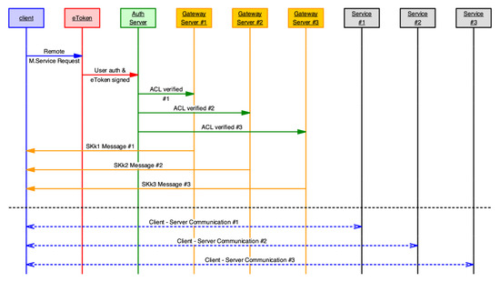 - Authenticator server (AS): this server verifies the authenticity of the message and requests access to the gateway server. Another authorisation process checks the ACL rules for accessing the services;