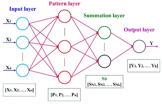 GRNN is one of the machine-learning applications and a powerful regression model. GRNN can be defined as a type of radial-basis-function (RBF) network that has a very high training speed based on a completely parallel structure. Even with low input data, this network is able to establish nonlinear relationships between the target variable and a set of independent variables [30,31]. Fast learning, meaningful communication between target time-series data and a set of explanatory variables and rapid convergence to optimal regression levels with an increasing number of samples are the most important advantages of GRNN [32,33]. As Figure 1 shows, the input layer, the pattern layer, the summation layer and the output layer form the GRNN structure [34].