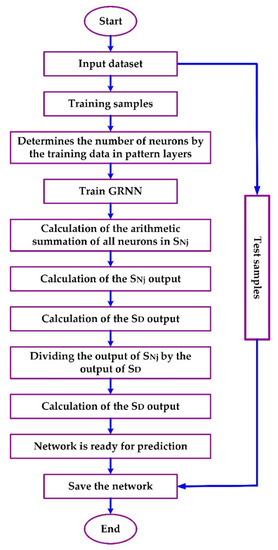 In the GRNN structure, the summation neurons calculate the sum of the weighted outputs of the pattern layer, while computes the unweighted outputs of the pattern neurons. The output layer divides the output of the S1 neuron by the output of the neuron to yield the desired estimate [35]. Figure 2 illustrates the flowchart of the GRNN.