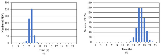 Then, arrival/departure times were fitted on a normal distribution, and 500 new arrival/departure datapoints were generated using the Monte Carlo simulation. It should be noted that in the literature, usually normal distribution was used to model the arrival/departure times [13]. Hence, normal distribution was employed in this work. The produced new dataset was utilized as inputs of the trained and saved network to forecast new traveling distances. This process was repeated 200 times to generate different scenarios. Figure 10 shows arrival and departure times for the generated new dataset for two of the scenarios. All of the PEVs were assumed to have a lithium-ion battery with the capacity of 30 kWh, charging efficiency of 0.88 and discharging efficiency of 0.28 kWh/mile.
