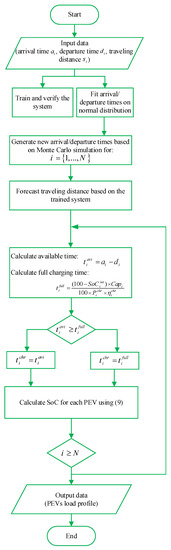 So far, much of the literature has tried to forecast the load profile of EVs using different techniques. Generally, these techniques can be divided into four categories: 1—Probabilistic-based methods: a stochastic model of the plug-in EVs (PEVs) to extract PEV load demand considering nonlinearity of the battery behavior in charging mode has been proposed in [10]. A stochastic method for day-ahead scheduling considering the uncertainty of EVs’ load has been presented in [11]. A stochastic-scheduling model for EV charging in the domestic grid has been proposed in [12]. 2—Markov chain method: a hybrid Grey/Markov model was utilized in [13] to consider the object-principle trend and fluctuation in the load forecasting of EVs. The Markov model and the hidden Markov model have been utilized to model the EVs’ traveling behavior and demand [14]. A Markov process has been applied to improve the security of supply in [15]. 3—Queuing theory: a single-EV charging model has been developed for multiple EVs using queuing theory in [16]. In [17], the rapid-charging-station model has been formulated based on queuing theory. 4—The fourth method is based on traffic studies and origin–destination (OD) concepts [18,19,20]. In addition, a comprehensive review and comparison of load-modeling techniques is available in [9]. All these mentioned works suffer from considering the correlation between datasets. However, this issue can be addressed using an artificial neural network (ANN) and machine-learning methods.