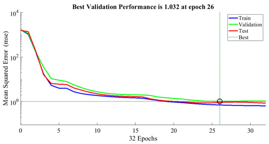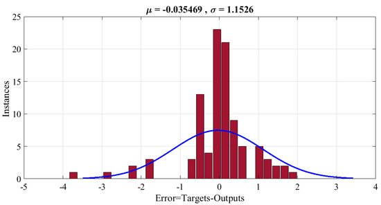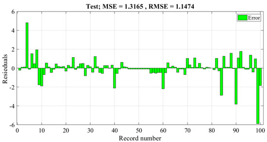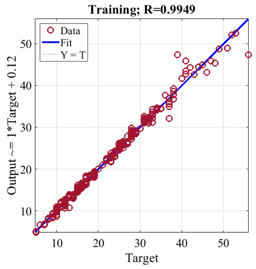 Figure 5 shows the correlation coefficient between the input and output variables for the training phase. Figure 6 illustrates the performance of the network in the form of MSE in the training phase. The results provided for training indicated good correlation of the network, with R = 99.49% accuracy at this stage. Figure 7, Figure 8 and Figure 9 also show the results of the R, MSE and RMSE errors and the error histogram in the test phase, respectively.