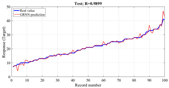 Evaluating the performance of each study is considered the most important part. With this evaluation, the results of each study can be verified. Evaluating and ensuring the performance of results can be done in a variety of ways [36]. In this paper, the correlation coefficient (R), mean square error (MSE), root-mean-square error (RMSE) and mean absolute error (MAE) were used as statistical performance criteria to evaluate the performance of the GRNN method. Each of these criteria provides unique analysis and evaluation. Therefore, the highest value of R to 1 and the lowest values for MSE and RMSE to zero indicate the best network performance. Each of these statistical performance criteria can be calculated as follows [37,38]: