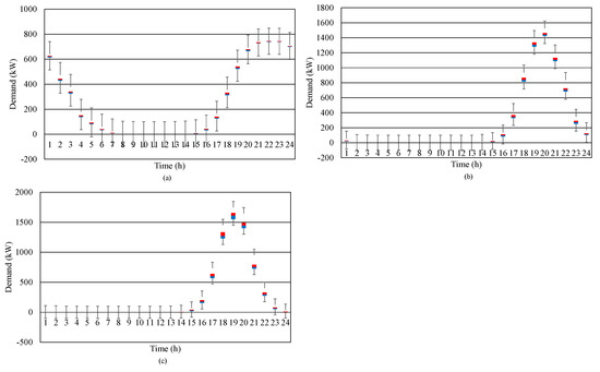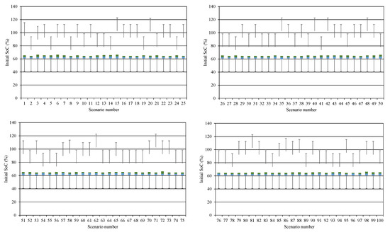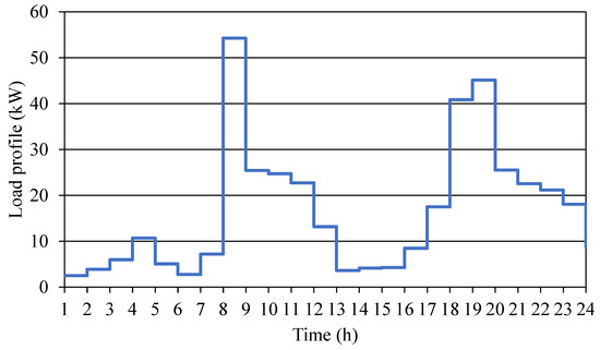 PEVs start to be charged with rated power after arriving at the parking spot until the charging time has elapsed. Charging time of each PEV depends on its initial SoC at the arrival time. The initial SoC for the whole of the PEVs for different scenarios is depicted in Figure 11. It can be seen that most of the PEVs arrived at the parking spot with more than 50% SoC, i.e., more than 15 kWh of energy. Simultaneously with the PEVs’ arrival time, residential homes’ demand started to rise. A traditional home load profile is provided in Figure 12. A comparison of Figure 11 and Figure 12 indicates that PEVs have great potential to help the peak shaving of residential homes in the way of discharging at the on-peak hours, i.e., t = 18:00 to t = 00:00, and then starting to charge at 01:00 until departure time. The main concern here is maybe that available time from 01:00 until PEVs’ departure time is not enough to charge the PEVs up to an appropriate level that meets their daily traveling-distance requirement. For a residential home, the charging level is 1.5 kWh. Let us assume that each PEV starts to be charged instantly after arriving home with the 1.5 kWh rating power. Figure 13a shows the load profile of whole PEVs for different scenarios with the 1.5 kWh charging rate. In addition, load profiles of five different PEVs for two different scenarios are shown in Figure 7. According to Figure 14a, EV number 1’s, 2’s, 3’s and 5’s demand at the final hour of the charging period was a fraction of rated power due to their demand being fully met and their battery that could be fully charged before leaving the parking spot. This means that their available time for charging was enough to charge their battery up to 100%. However, EV number 4 could not be fully charged because of the lack of available time, and it charged with the rated power until it left the parking spot. Figure 13a shows that from the PEVs’ arrival times (t = 15:00), the load profile had ascending behavior with the increasing number of PEVs, where the peak load occurred at time t = 23, when almost all PEVs were plugged into the grid, and 750 kW of power was required at that time. Then, from the hour t = 08:00, PEVs left the parking spots and the load profile had descending behavior. In total, nearly 6.8 MWh of energy was required to meet PEVs’ demand in one day. According to this analysis with the low charging rate, it was not feasible to utilize PEVs as a storage system that can help peak shaving of residential homes. To do so, a higher level of charging rate is required. Figure 13b,c shows the load profile of PEVs with higher charging levels. Table 1 describes adopted charging levels. The more the charging rate rose, the more energy was required at peak hours. In the case of II and III charging levels, 1.5 MWh and 1.7 MWh of energy were required at peak hours, which can cause bus-voltage drops and line-current violations. Therefore, an accurate model for PEV load profile is very necessary to optimally schedule the system in order to benefit from the great potential of PEVs from the power system and environmental points of view.