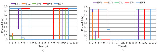 Individual PEV load profile in (a) first scenario and (b) second scenario.
