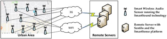 In this section, we define the architecture for a smart WASN; that is, a WASN capable of identifying the source of noise events and, consequently, providing an more accurate measurement of the different noise types. In order to make the WASN scalable, we designed it as a distributed intelligent system in which smart acoustic sensors (i) capture the audio, (ii) process the audio frames to obtain the label of the noise event using a machine learning algorithms, and (iii) send this information to a remote server. The transmitted data are the acoustic pressure level (), the label of the acoustic event, and its timestamp. Finally, the output of this processing is plotted with Sentilo, an IoT platform that we use for representing the audio information on the different locations.