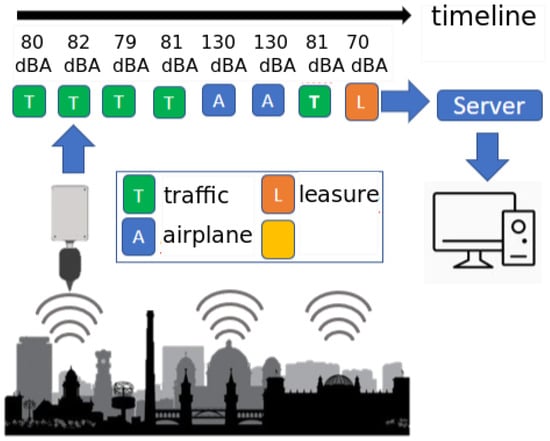 The emergence of Wireless Acoustic Sensor Networks (WASNs) represents a paradigm shift in the way the END regulatory requirements can be addressed, by enabling the generation of real-time dynamic noise maps. The difficulty with automatic map updating is that most acoustic sensors in WASNs can only measure the A-weighted equivalent noise level , without determining the source of the sound. Therefore, the resulting map may represent a mix of the noise sources (traffic, airplanes, people, construction works, etc.) present in the acoustic environment, not fulfilling the requirements of the END [], which requires a distinction of the noise source. Moreover, as shown by several projects developed in Europe and in America over the last years, authorities are starting to ask for the distinction of noise sources, so that they can design more effective policies []. For example, in the SENSEable PISA project [,], authorities are not only interested in the acoustic pressure levels of noise, but also in distinguishing their sources to determine the relationships between certain types of noise and their health effects. The DYNAMAP project [,] also requires the distinction between road traffic noise and any other kinds of noise (named Anomalous Noise Events—ANE) in order to build real-time traffic noise maps. Finally, the Sounds of New York Project (SONYC) have also gathered huge amounts of acoustic data from the city of New York to classify the ten most frequent types of noise across the city [].