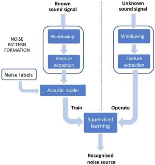 The technology is based on supervised learning, which consists of two main processes, as shown in Figure 3: (i) Signal feature extraction, and (ii) noise event identification. The signal feature extraction process obtains a features set representing the acoustic characteristics of the noise signal. Subsequently, a feature vector is computed upon each frame, thus obtaining a compact representation of the signal. Then a supervised learning system is trained with multiple samples of noise events recorded in the real environment. As a result of this training process, the system is capable of distinguishing between different types of Anonymous Noise Events (ANE), thus being able to label new incoming noise samples as belonging to different noise sources. Examples of ANEs are the sound of people, car, motorcycle, bell, etc.