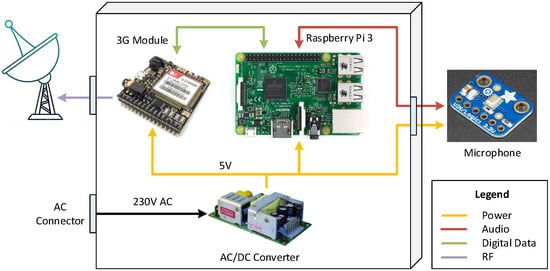Achieving a good trade-off between cost and accuracy is also the core idea of the WASN designed in the DYNAMAP project [,], which identifies the sound sources in the sensor by means of the ANED algorithm []. However, it only distinguishes between road traffic noise and any other Anomalous Noise Events (ANEs). This project deployed pilot WASNs in the Italian cities of Rome [] and Milan [] to evaluate the noise impact of road infrastructures in suburban and urban areas, respectively. The WASNs deployed in DYNAMAP are hybrid, combining two types of sensors []: (i) High-capacity ARM-based sensors that use signal processing techniques to analyze and process the acoustic signals within the nodes, and (ii) low-capacity Controller (C)-based sensors, which despite less computational capabilities maximize the coverage of the network, as their solar panels allow for greater flexibility in terms of sensor positioning. Our approach differs as it proposes low-cost sensor nodes with enough computational capacity to run improved machine learning algorithms for a more accurate detection of the sound source in each situation under test. While the low-capacity C is the lower cost solution, it is not able to process the sound recognition algorithms used in our solution. On the other hand, while the high capacity sensors in DYNAMAP are able to process the sound recognition algorithm with a similar cost, the time to market and the cost of the custom platform development is much higher than in our proposal, which takes advantage of custom subsystems to build the sensor, which in terms of hardware, simply connect a Raspberry Pi with peripherals. The development of a custom hardware requires a huge effort in terms of human resources and time to design the schematics, the printed circuit boards (PCB), testing and validating the system, which increases the time to market and the cost.