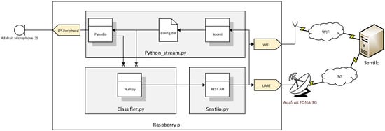 The software of this smart wireless acoustic sensor has been implemented in Python due to the huge documentation and libraries available online. The algorithm is basically comprised by the three main tasks shown in Figure 7: (i) Acquisition of audio frames, (ii) classification of the source of sound and, finally, (iii) the transfer of the results to Sentilo and the SmartSense platform. This algorithm has a resource consumption of CPU between 55% and 75% and a RAM memory of 8.5%.