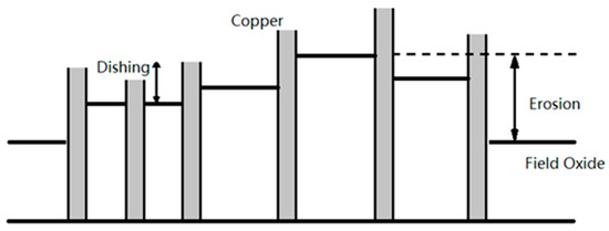 The materials on the surfaces of chips cannot be removed evenly. The removal rate is determined by the slurry, the abrasives, the pressure, the relative rotational speed between the chip and pad, and many other factors. The variance caused by CMP can be categorized into two types: random variation and system variation [3]. Random variation is made up of the fluctuations during fabrication processes [12], including random dopant fluctuations and line edge roughness. Random variation is generated from the fabrication process and is hard to mitigate via design methods. System variation is mainly caused by CMP pattern effects [13,14,15]. The layout pattern strongly influences the removal rate during the CMP process. CMP planarization models try to study these pattern effects to make precise predictions of the post-CMP surface height to help optimize the layout design.