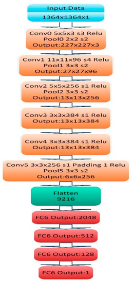 Conv0 and Pool0 were designed for data preprocessing. In our experiment, the input size of a single prediction operation was set to , representing an area of with a single layer. The Conv0 receives and implements a convolution operation with a kernel size of and stride 3 to output . Then, the Pool0 changes the data into , so that the format of the data suits the middle layer of AlexNet.