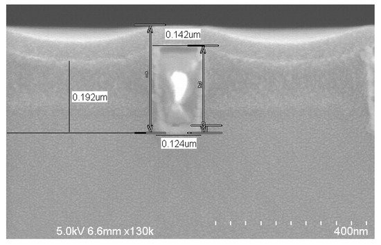 For each test pattern, AFP and SEM were used to measure the dishing defect of the center position. For the DSH-based CMP model, equivalent parameters of the test patterns were extracted and used to make predictions. For the CNN-based CMP model, the test pattern and measured defects of the training set were used to train the network and predictions were made for other test patterns. The predictions of the two models were compared. Figure 4 shows an example of a SEM picture of a single sample. The labeled dishing defect of the sample was calculated using the measured results.