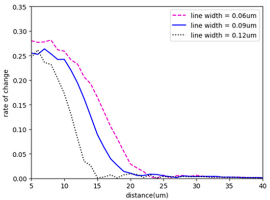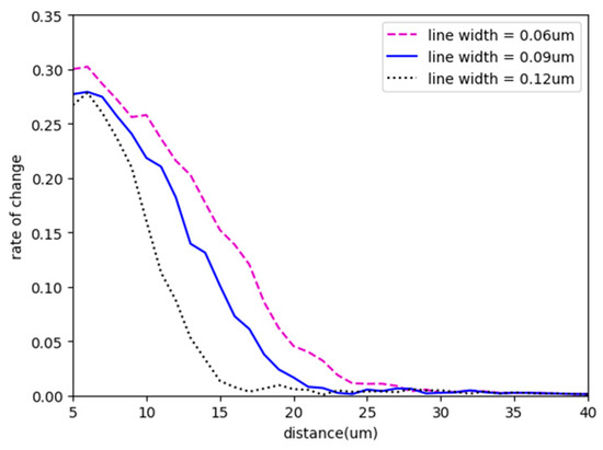 Patterns with 0.06 um, 0.09 um, and 0.13 um gate widths; and 0.15 um, 0.30 um, and 0.45 um gate spaces were designed and input to the trained CNN-based CMP model, as Section 5.2 shows. The results are shown in Figure 10, Figure 11 and Figure 12 for 0.15 um, 0.30 um, and 0.45 um spacing, respectively. The horizontal ordinate is the horizontal length within which the vertical gates are kept. The vertical ordinate is the rate of change of the dishing defects compared with the basis . Table 1 shows the average minimum , which keeps the rate of change of the dishing defect within 5% compared with .