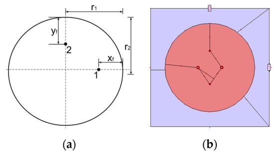 In Equation (1), terms a and b represent the horizontal and vertical dimension of the resulting shape. The “contribution” of each term is determined by n2 and n3 while n1 defines the sharpness of the supershape corners. As stated in [], “For n1 = n2 = n3 = 2 and m = 4 an ellipse is obtained. A circle is obtained when additionally, a = b”. The Equation (1) has no units because the supershape dimensions can be assigned to any (i.e. mm or cm etc). To achieve dual band behavior, two feeding points are chosen for the proposed SPA, one on each of the two axes. The geometry of the antenna, with the positions of feeding points, is shown in Figure 1.