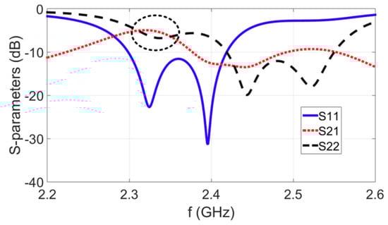 As it is observed, there is an issue with the coupling between the two ports because it is not negligible as it is for the SPA (Figure 2). Especially in 2.32 GHz (black circle) S21 has its maximum value (≈−5 dB) and as such it is expected to have little to none radiation to that frequency area. This could be countered using a proper matching circuit, which will transform the Zin2 = 130 Ohm to 50 Ohm while will keep the Zin1 = 50 Ohm at the same time, as it has been described in []. Given that, in Table 4 the frequencies and bandwidth of each resonance are listed.