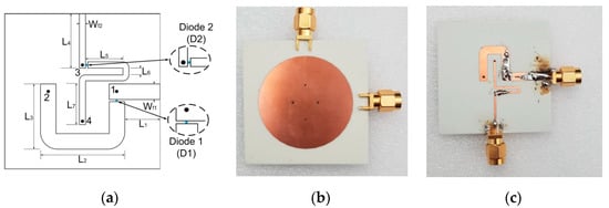 The use of PIN diodes can give different radiation and matching characteristics leading to the result that modified SPA becomes a reconfigurable antenna. The antenna with the PIN diodes is shown in Figure 5, where the positions of diodes are shown (the blue rectangles), while the other dimensions are the same as before, given in Table 3. Also, the top and bottom views of the fabricated prototype are given. The different states of the PIN diodes (ON or OFF) create 4 possible cases to explore, as explained in Table 5.