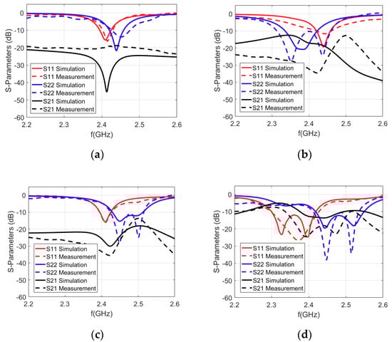 S—Parameters for each case of Table 5, (a) Case 1, (b) Case 2, (c) Case 3 and (d) Case 4.