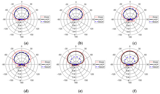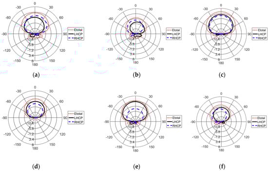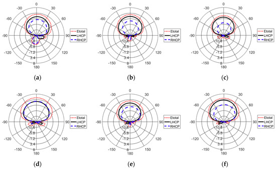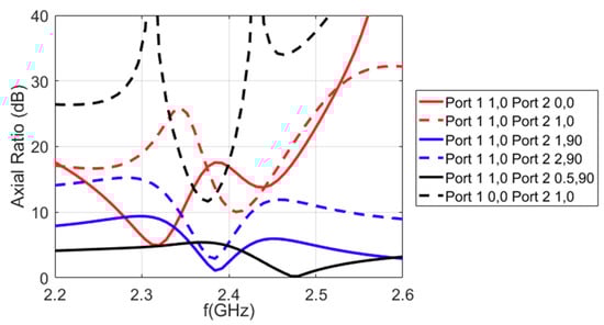 In Figure 7, Figure 8 and Figure 9 there are several different polarizations depending on the port configuration. For example, in Figure 7a–d we have LHCP and RHCP but with equal amplitudes. The result is linear polarization because the LHCP negates the one axis of RHCP and vice versa. On the other hand, in Figure 7e–f, since the LHCP is the same as the total E–field, while the RHCP is significantly weaker, we have circular polarization. In the rest of the patterns (Figure 8 and Figure 9), in some circumstances, neither LHCP nor RHCP are equal with the total E-field. This is indicative of a combination of those circular polarizations resulting to elliptical one. To sum up, by exciting different ports, linear or circular – elliptical polarization can be achieved. In fact the exact circular polarization could be a result of different amplitude between feeding ports because the original polarization is elliptical and so we can make use of Left Hand (LH), Right Hand (RH) circular-elliptical or even linear polarization. This can also be seen in Figure 10 where the axial ratio is observed for the different configurations of ports in Case 2 (D1 On and D2 Off). Each port excitation is in the form A, θ for A·ejθ (his configuration is selected at random to extract a distinct figure).